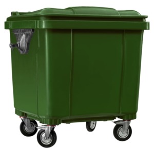 حاوية نفايات بلاستيكية سعة 1.0 متر مكعب، مزودة بغطاء وعجلات.