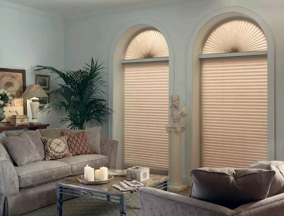 If you’d like to visually simplify the composition, install a straight rail below the arch’s curve. This approach lets in more light and works well in rooms with high ceilings — you preserve the focus on the window’s shape while adding a clean horizontal line.