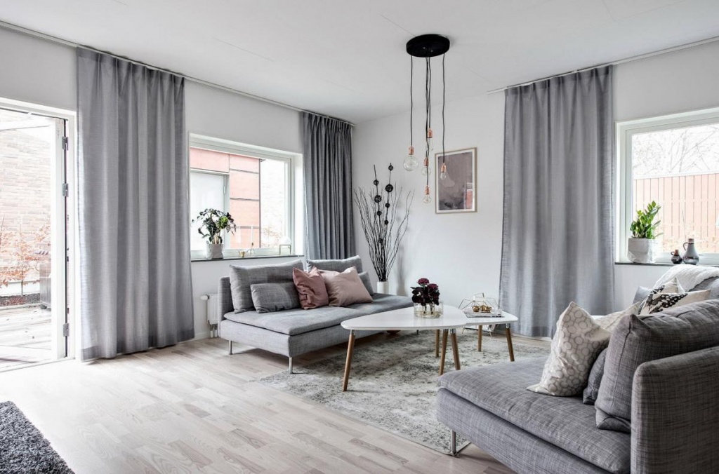 In sunny rooms, use thick gray curtains — they softly diffuse light and create a cozy ambiance.